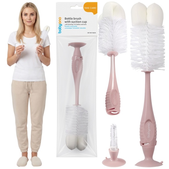 Szczotka do mycia butelek i smoczków Babyono z przyssawką i gąbką blady róż