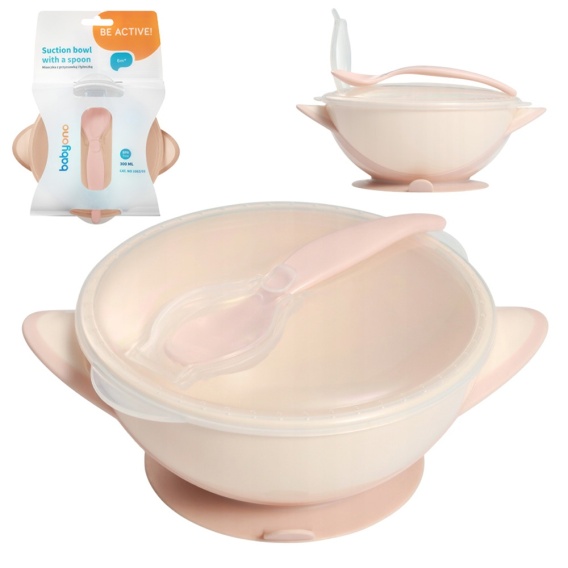 • Talerzyk z przyssawką Babyono miseczka z łyżeczką do karmienia kremowy róż