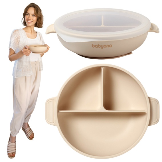 Talerzyk z przyssawką Babyono silikonowy z przykrywką do nauki beżowy 6+