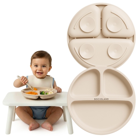 Talerzyk z przyssawką silikonowy 3 komorowy dla dzieci Bocioland jasny beż